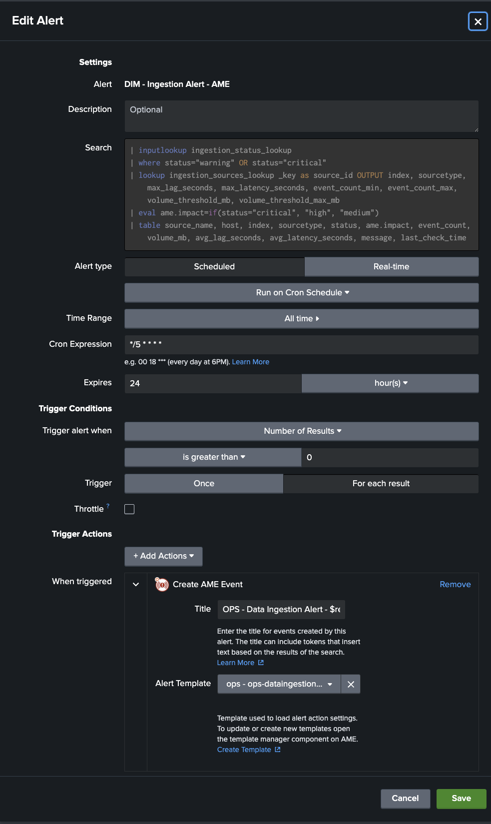With this, I was able to wire it up with Alert Manager Enterprise (AME). AME takes the detection of the DIM app from the lookup table and turns the results into actionable AME events: