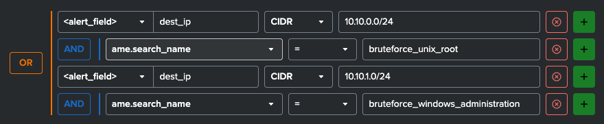 (ame.search_name == 'bruteforce_unix_root' AND dest_ip="10.10.10.0/24")
