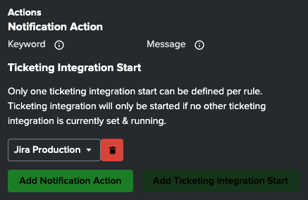 Only one ticketing integration start can be defined per rule. Ticketing integration will only be started if no other ticketing integration is currently set & running.